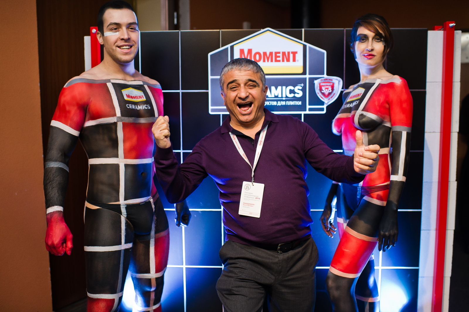 | | Наглядная демонстрация простоты использования нового продукта на рынке - системы для кафельной плитки. Берем стену, которую участники собрали на прошлой конференции и клеим на нее плитку. Затираем швы и готово!