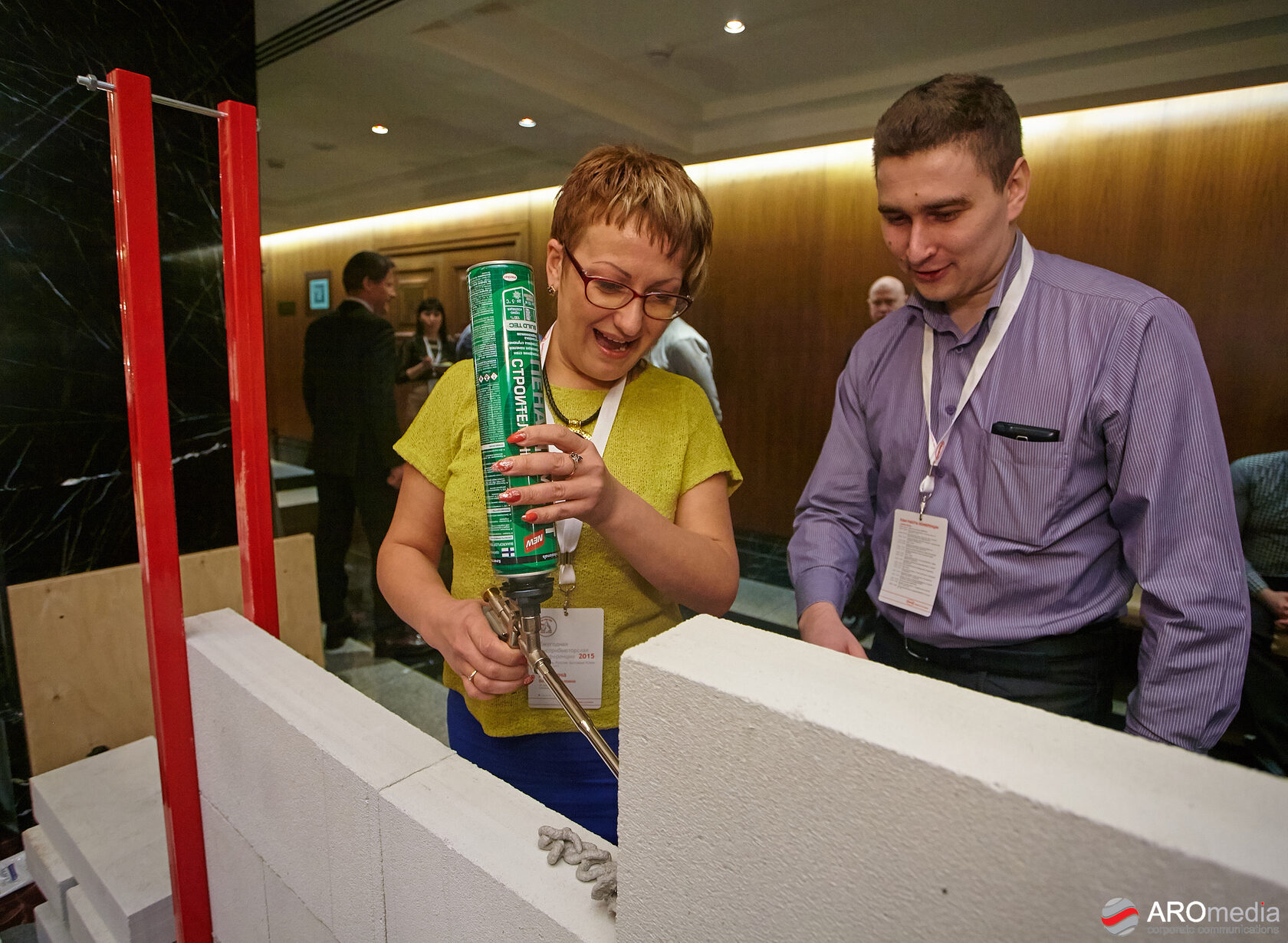 | | Производитель выводил на рынок новый продукт - пену-цемент. Мы показали как сами участники просто и без пыли могут построить настоящую стену за 15 минут в перерыве между сессиями. Даже руки не испачкали!